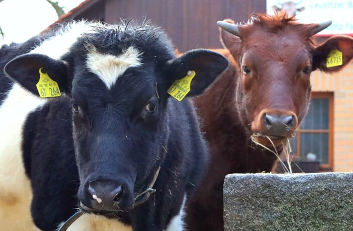 Świeży powiew w zagrodzie krów: dziesięciomiesięczne jałówki, Alma i Gerda, beztrosko hasają po terenie Łużyckiej Zagrody Wiejskiej w Zoo Görlitz pod bacznym okiem seniorki – krowy Gretel.